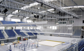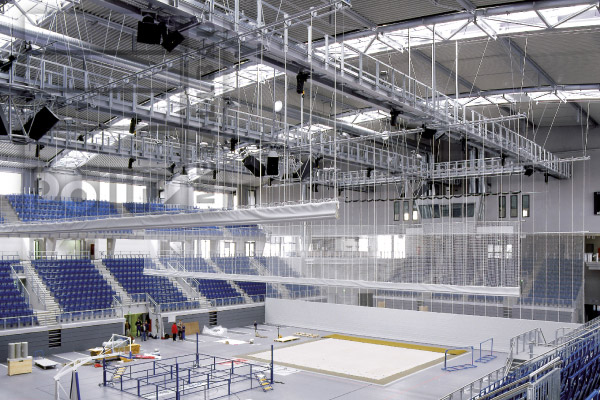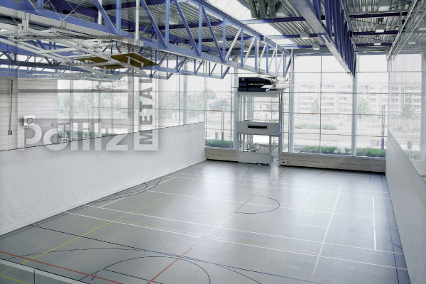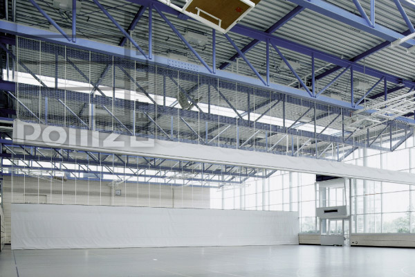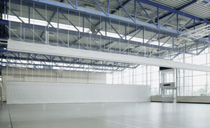 Die Raffung des Hallenteilers erfolgt über eine anlagenbreite Wickelwelle mit hochreißfesten Zuggurten.